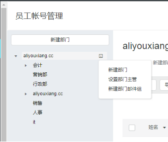 選擇對應(yīng)的上級目錄下,點擊新建部門(頂級部門都為郵箱的域名,無法修改或刪除)